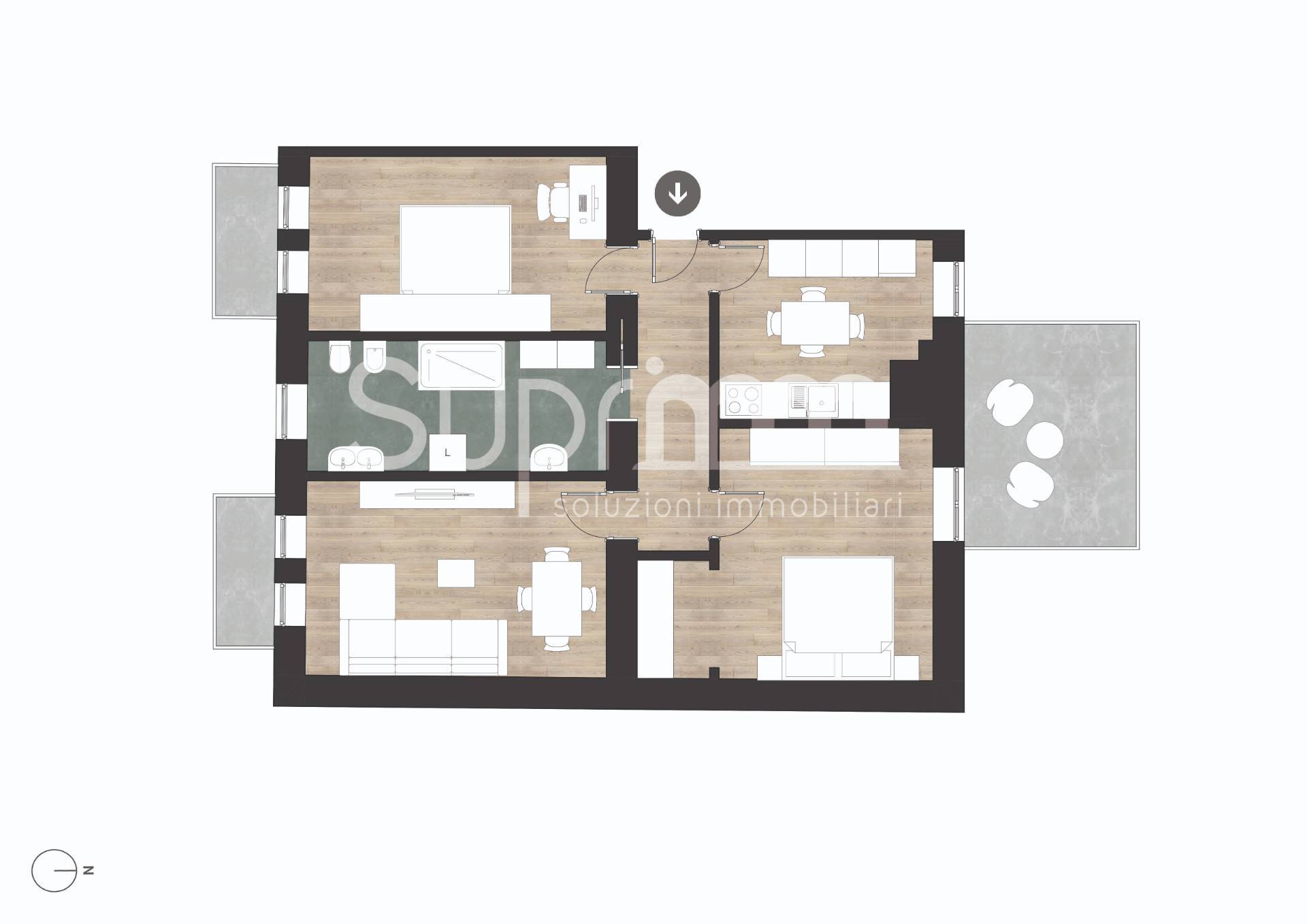 L'appartamento si sviluppa su una pianta regolare e funzionale. L'ingresso distribuisce in modo ordinato i vari ambienti della casa: da un lato la zona giorno composta da soggiorno e cucina abitabile separata, dall'altro la zona notte con due camere da letto di ampia metratura. Il bagno è finestrato e ben organizzato negli spazi.