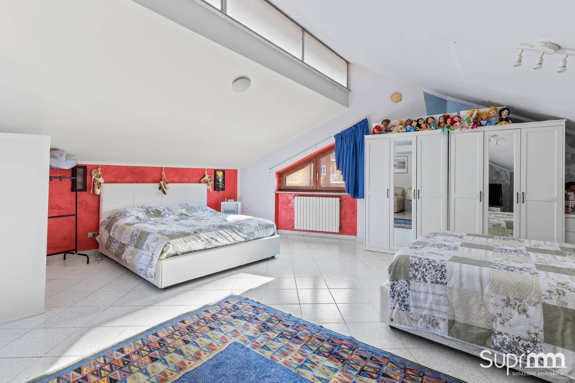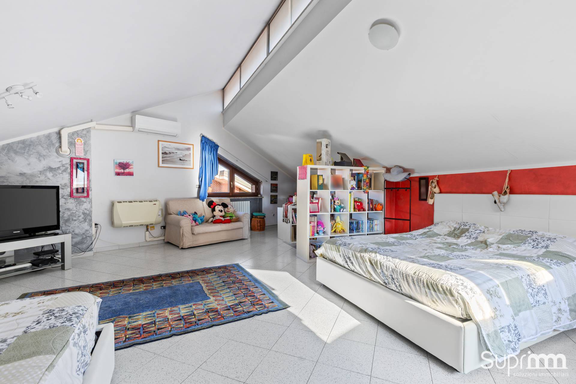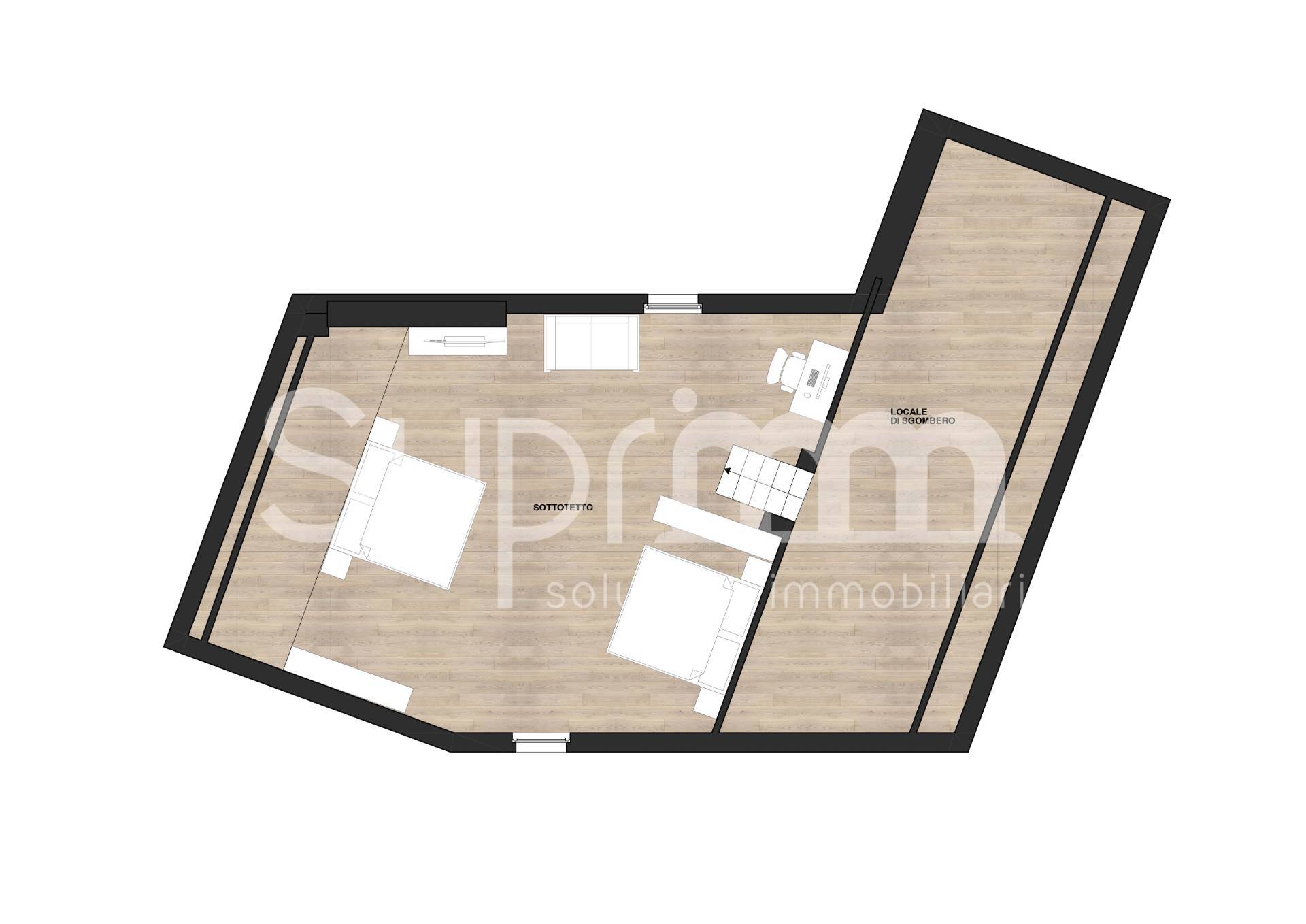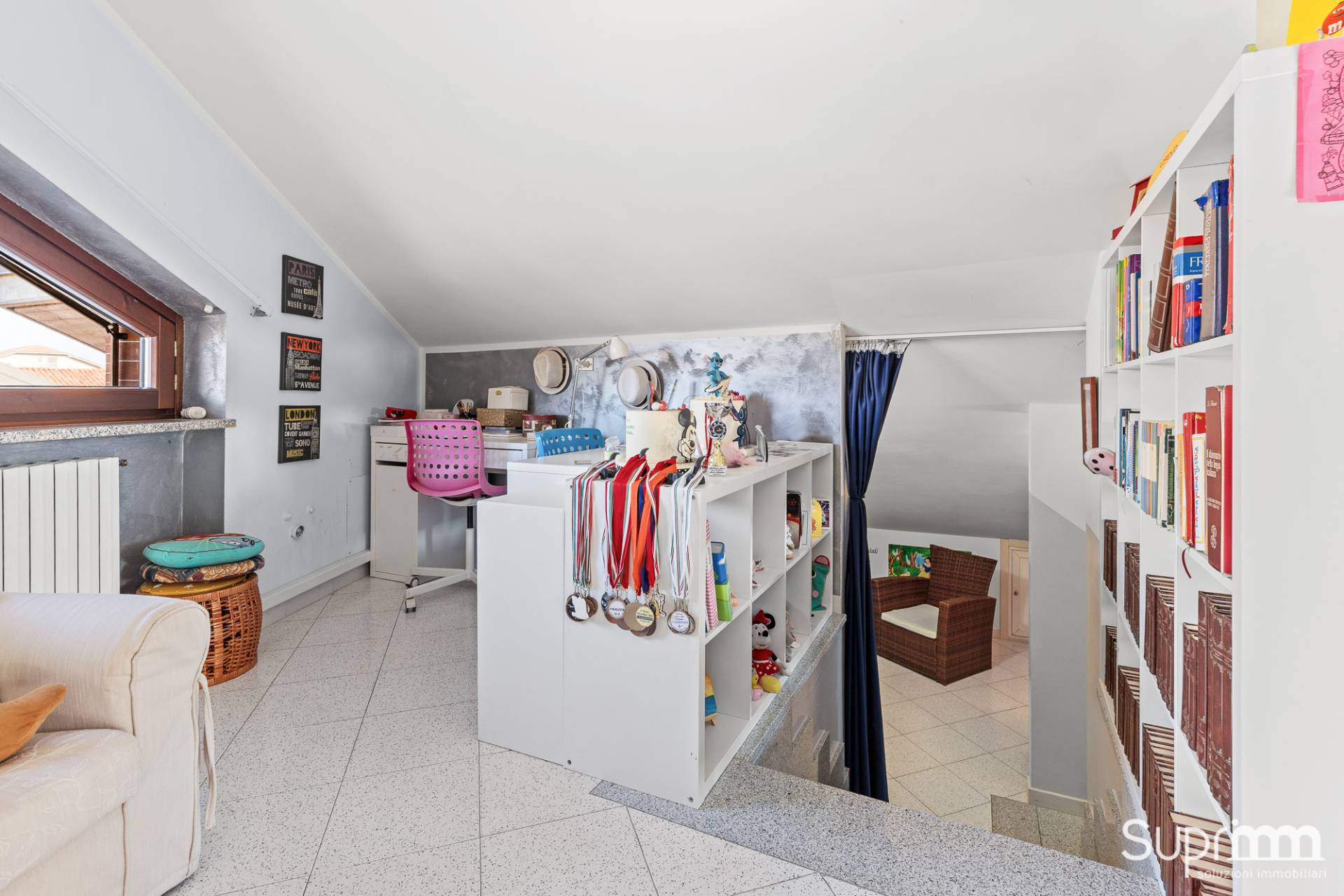 Dalla zona giorno si accede attraverso una scala interna al piano superiore, dove si sviluppa una mansarda di generosa metratura.